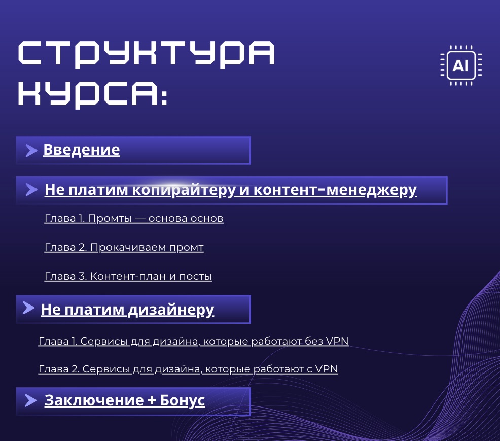 вы учитесь применять нейросети для создания текстов, контент-планов и визуального оформления, не нанимая копирайтеров, контент-менеджеров и дизайнеров.